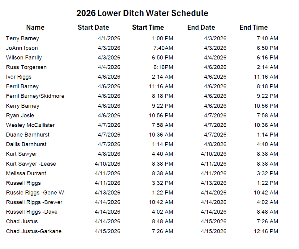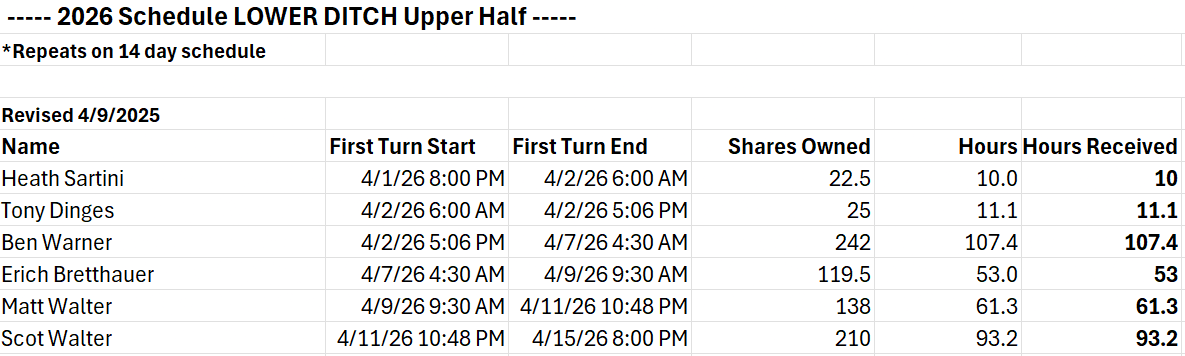 Repeats on a 14-day rotation beginnning 4/1. Subject to change based on Watermaster instructions.